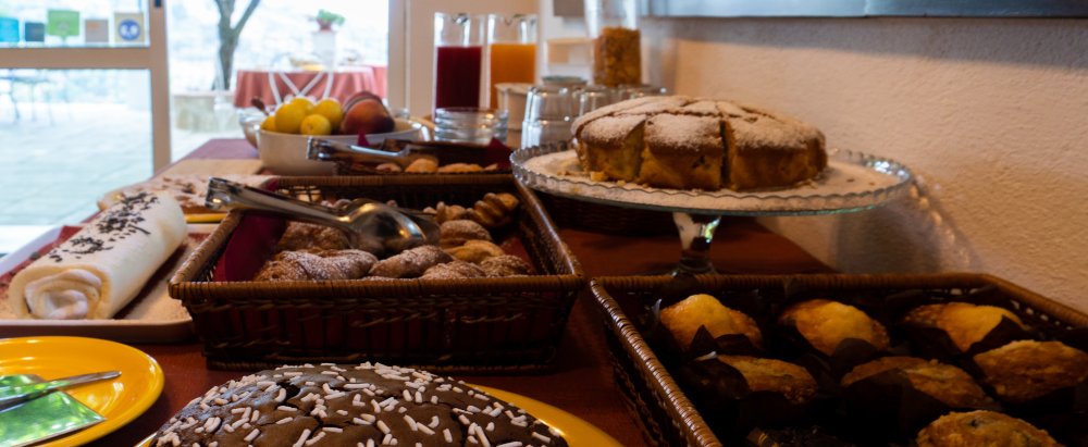 Ricca e gustosa, è servita nella saletta breakfast o sulla terrazza e preparata con prodotti freschi e genuini, rispettando i gusti e le esigenze di tutti. Potrete gustare dolci, torte e crostate fatte in casa, croissant appena sfornati, muffin e biscotti artigianali, pancake, cereali, yogurt, succhi, frutta fresca di stagione. Ogni tavolo prevede inoltre il suo cestino con marmellate, nutella, burro, miele, fette biscottate, tutto in monoporzioni.