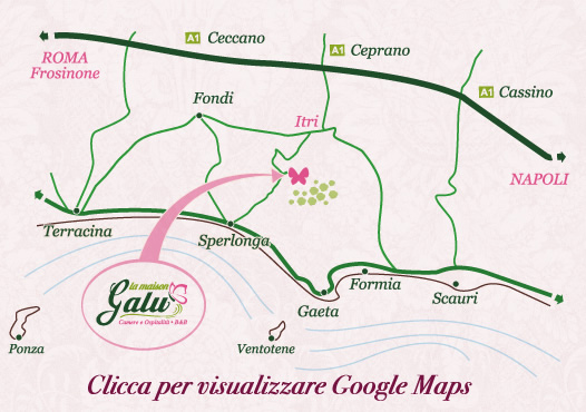 Se si proviene dall’autostrada uscire a Cassino e proseguire in direzione Formia. Successivamente prendere le indicazioni per Itri e dopo ancora per Sperlonga percorrendo la strada provinciale per 3,5 km fino al bivio dove sono le indicazioni de "la maison Galù".